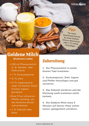Goldene Milch (Kurkuma-Latte): Diese ayurvedische Mischung aus Kurkuma, Ingwer und Pfeffer wirkt entzündungshemmend und antioxidativ. Sie unterstützt den Körper im Kampf gegen Infektionen und stärkt das Immunsystem auf natürliche Weise.
